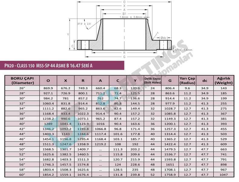 • PN 20 - CLASS 150 MSS-SP 44 ASME B 16.47 SERİ A